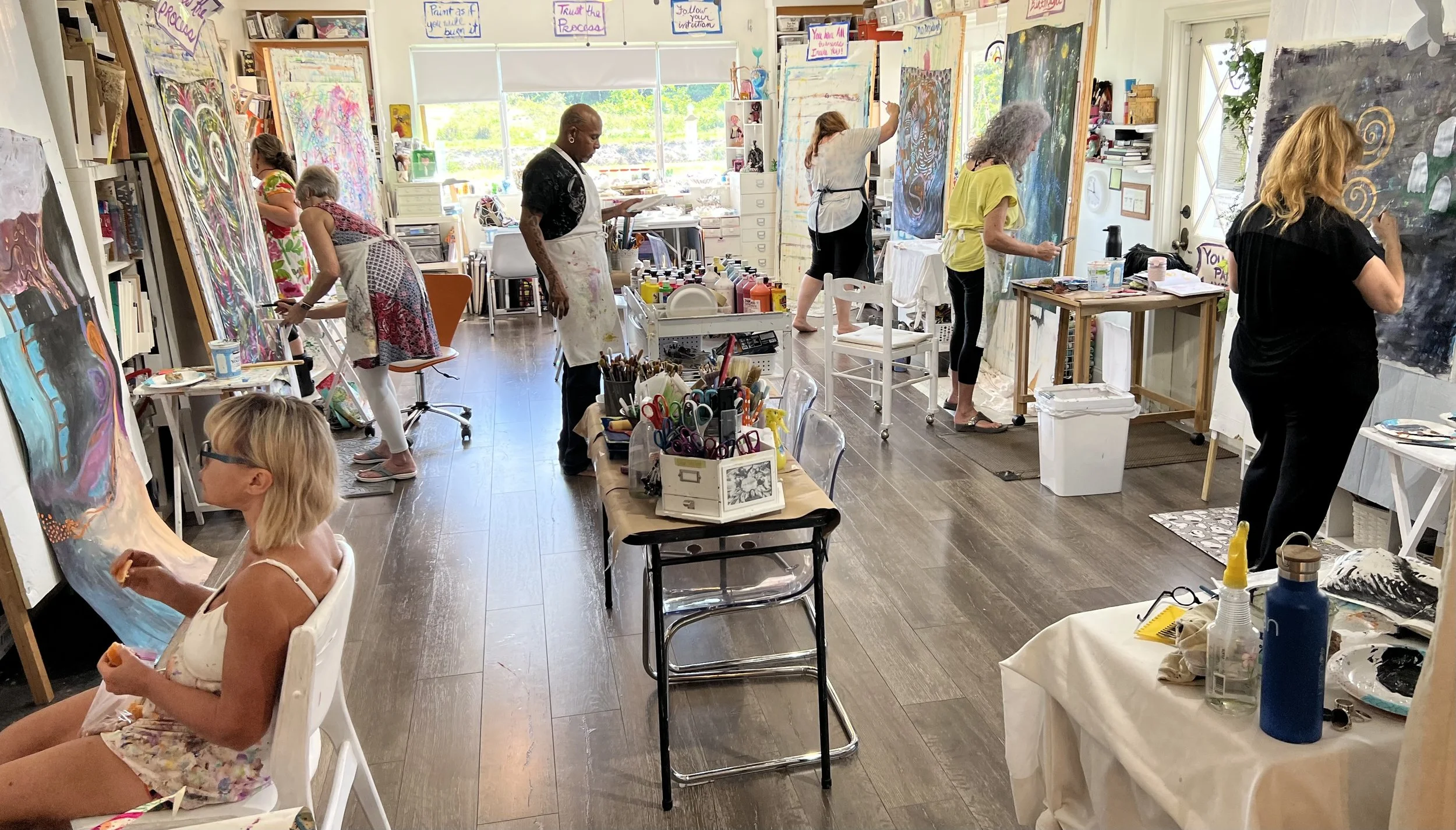 People often arrive thinking they’re coming to “paint,” and leave realizing they’ve been practicing something much larger—how to listen, how to stay open, how to trust what wants to move through them. The studio becomes a place where effort softens, judgment loosens its grip, and creativity begins to feel less like something you chase and more like something you receive. What unfolds in your painting has a way of quietly following you home.